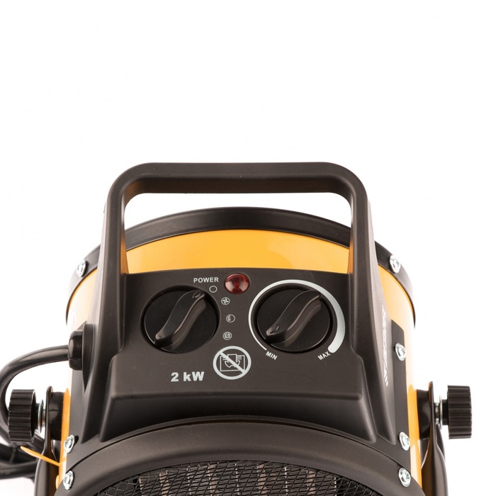 - Блок управления находится сверху на корпусе — благодаря этому удобно переключать режимы когда тепловентилятор стоит на полу.