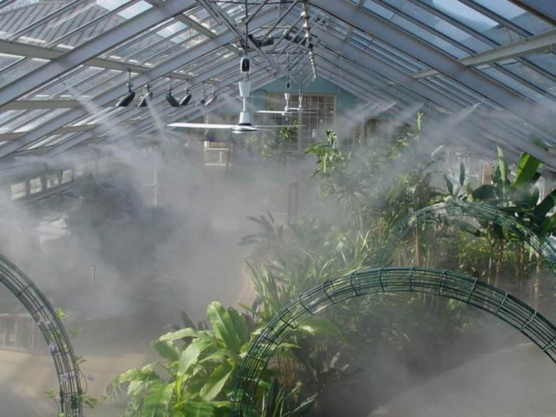 При прохождении через форсунки вода разбивается на микроскопические капли. Полученный туман испаряется очень быстро. При этом он не только охлаждает воздух и увлажняет его, но и помогает бороться с опасными для растений вредителями.
