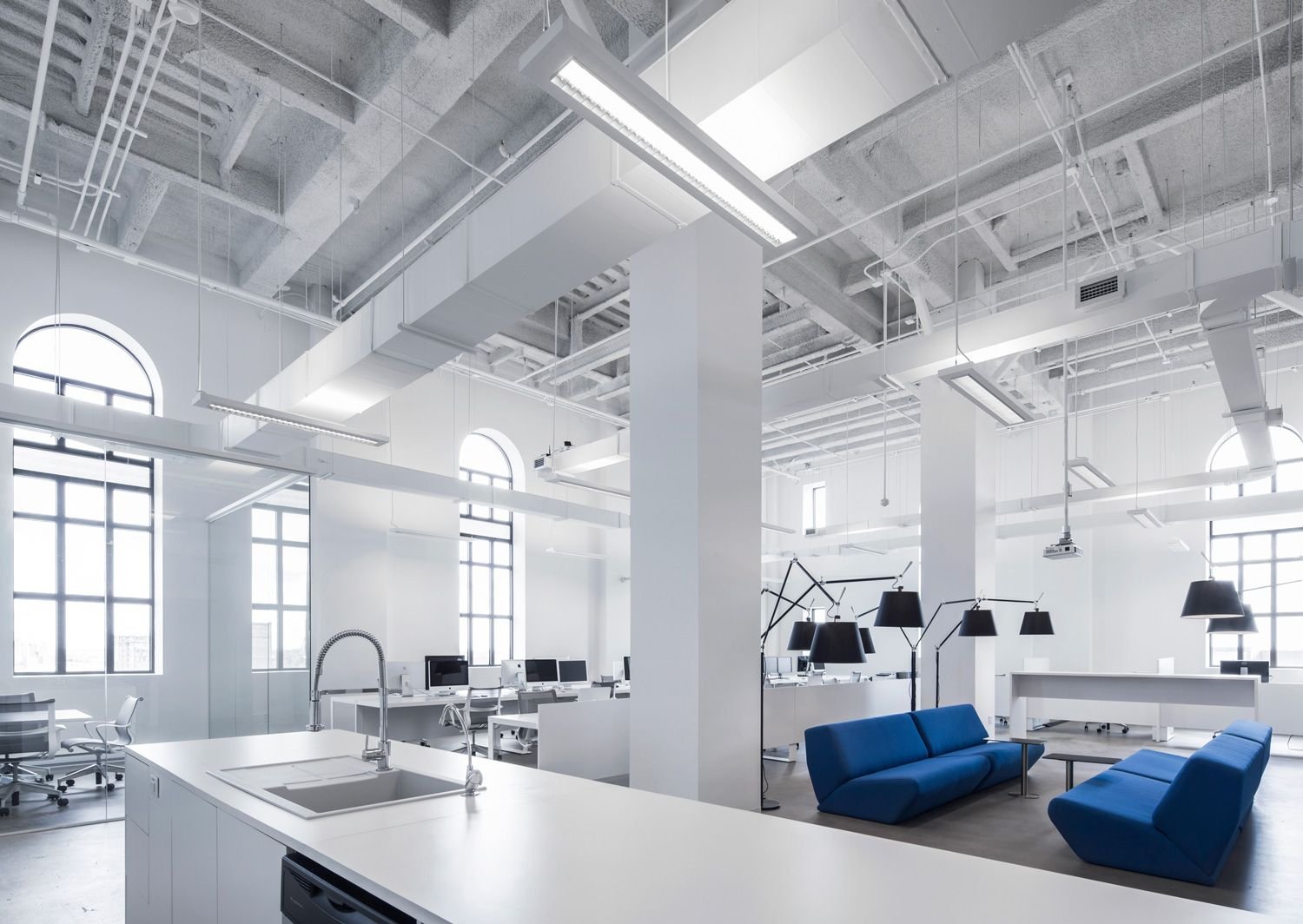 Офисные помещения с большим количеством сотрудников должны быть обеспечены свежим воздухом на 100 %. Речь идет примерно о 60 куб. м/ч на 1 человека. Расчет проводится с учетом площади рабочего места в пределах 7-10 кв. м. При этом зачастую используются системы наборного типа или их аналоги приточно-вытяжной конфигурации с максимально компактными габаритами.
